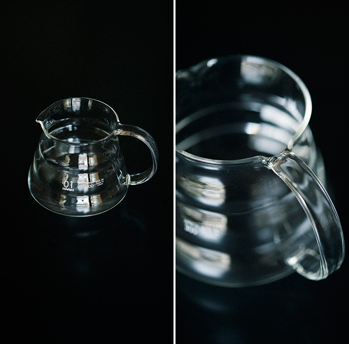 フタや取っ手もガラス製のシンプルなデザインのサーバーです。容量の目盛りや杯数の目盛りなど、ごちゃごちゃとした表記が無い潔さが嬉しい。フタはドリッパー受けとしても使えるので、テーブルの上でドリップするのにも便利です。