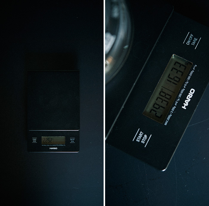 コーヒー豆の量とお湯の量、抽出時間を同時に計測出来る、ハンドドリップの為のスケールです。この上にサーバーと粉を入れたドリッパーを置いて0gにし、タイマーをスタートさせると、淹れたい量と抽出時間を正確に把握出来ます。